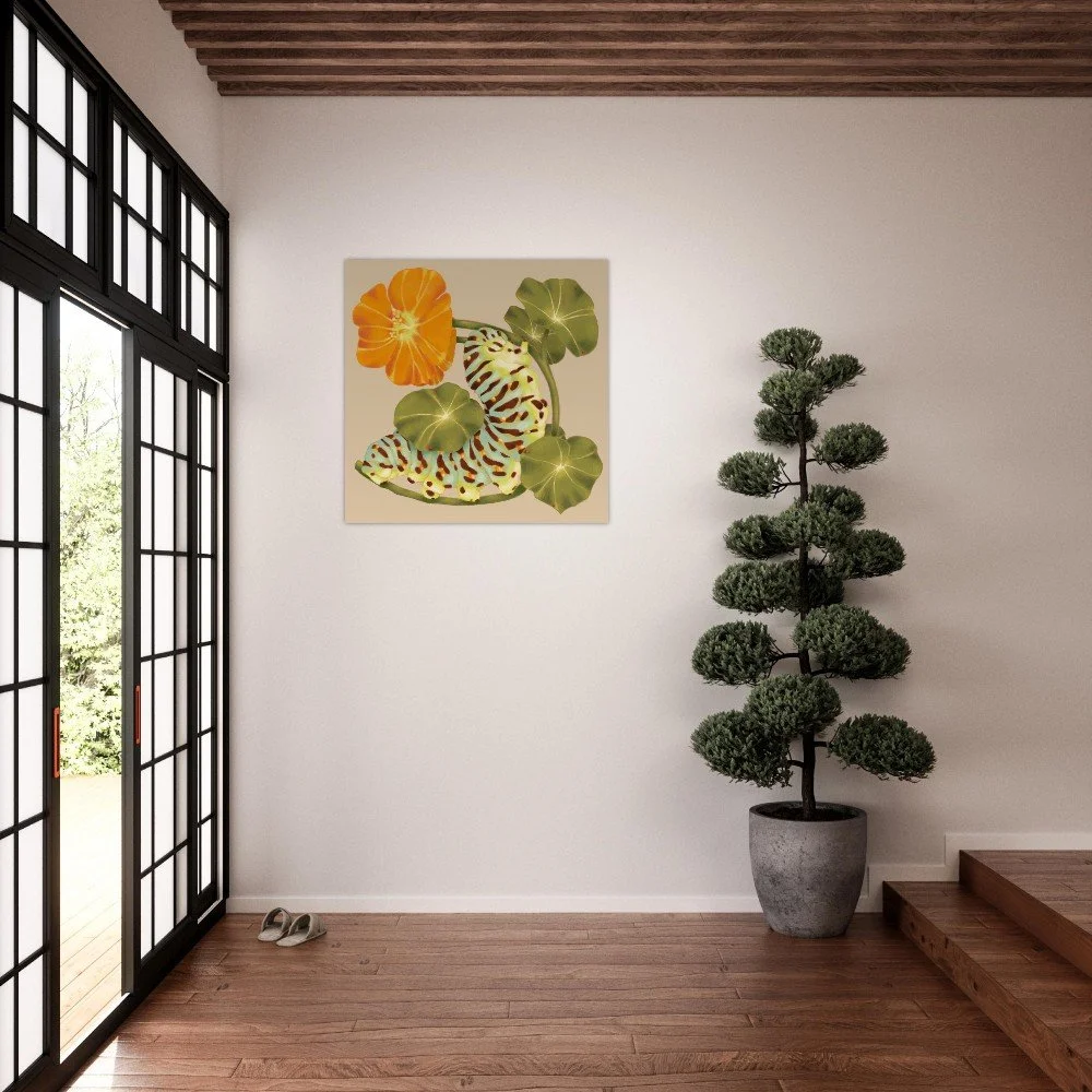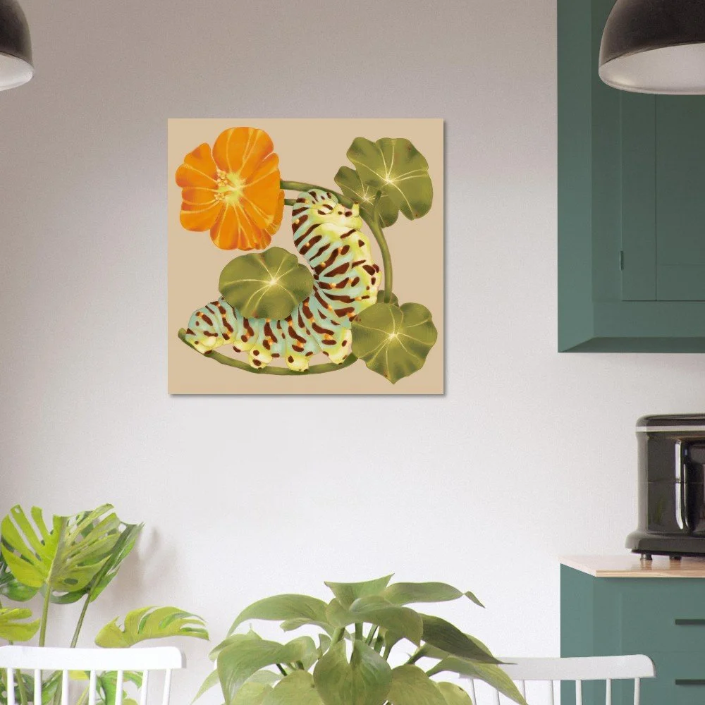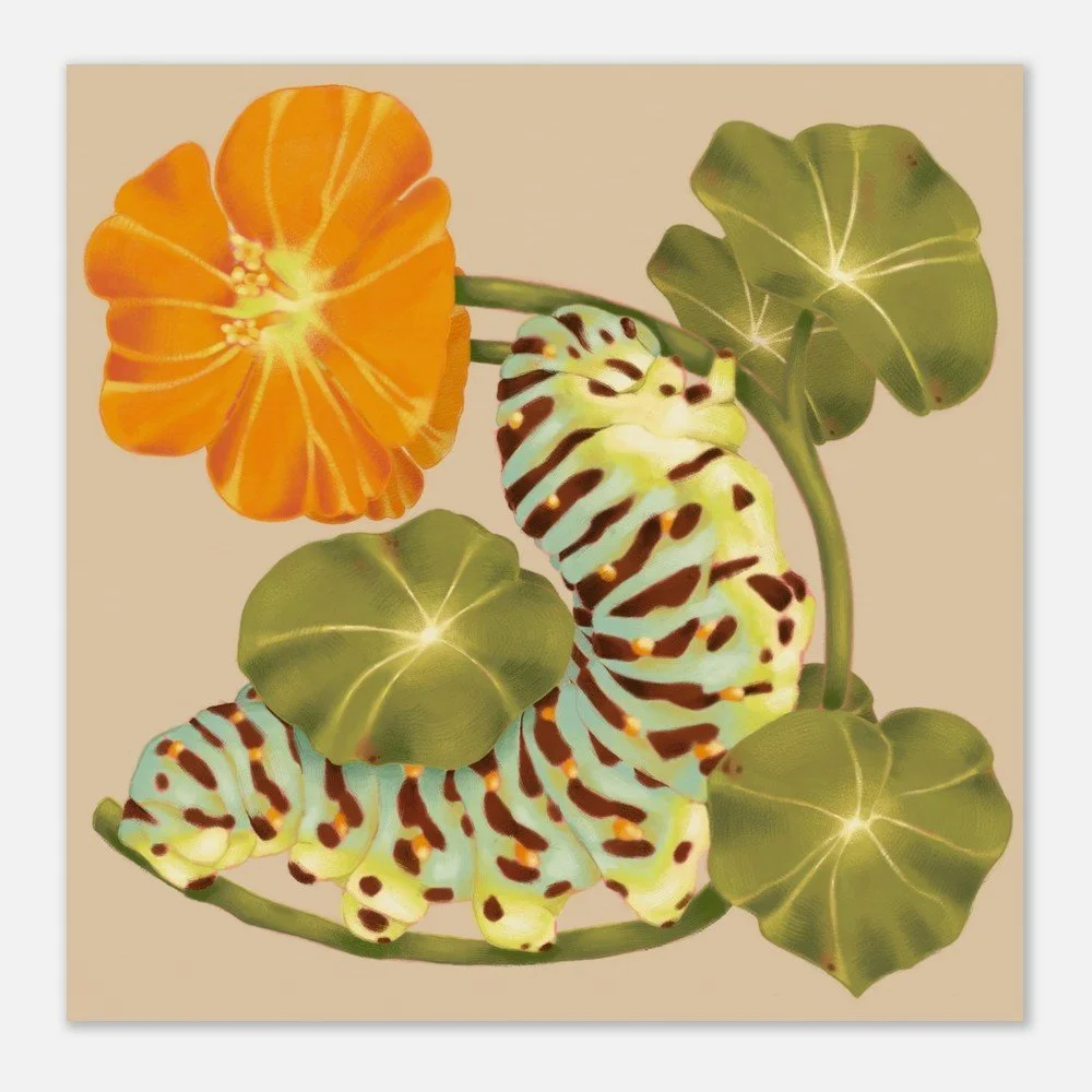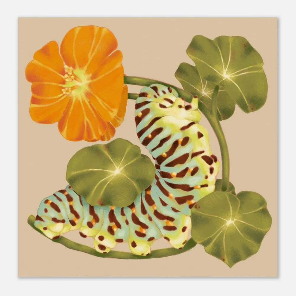 Invite the beauty of the natural world into your home with “Bloom and the Wanderer,” a museum-quality fine art print featuring a gentle, hand-painted caterpillar resting among lush nasturtium leaves and a vibrant orange bloom. This illustration blends warm botanical tones with a soft painterly texture, making it perfect for cottagecore interiors, plant lovers, and collectors of whimsical nature art. Printed on premium archival paper, each piece showcases crisp detail, rich color, and gallery-level quality designed to last a lifetime. Its square format makes it an ideal accent piece for living rooms, studios, reading nooks, and gallery walls. Learn about paper types and their unique textures and finishes here. No minimum orders, printed and shipped on demand.