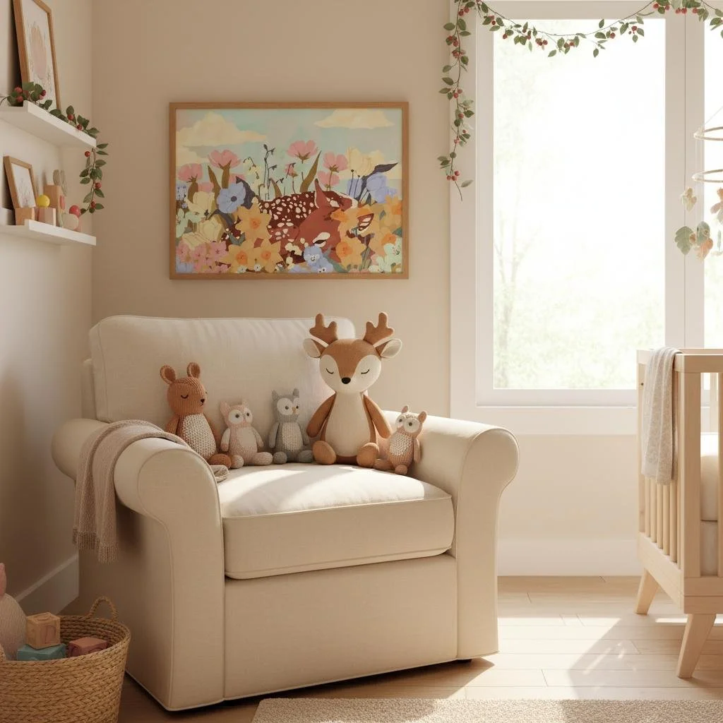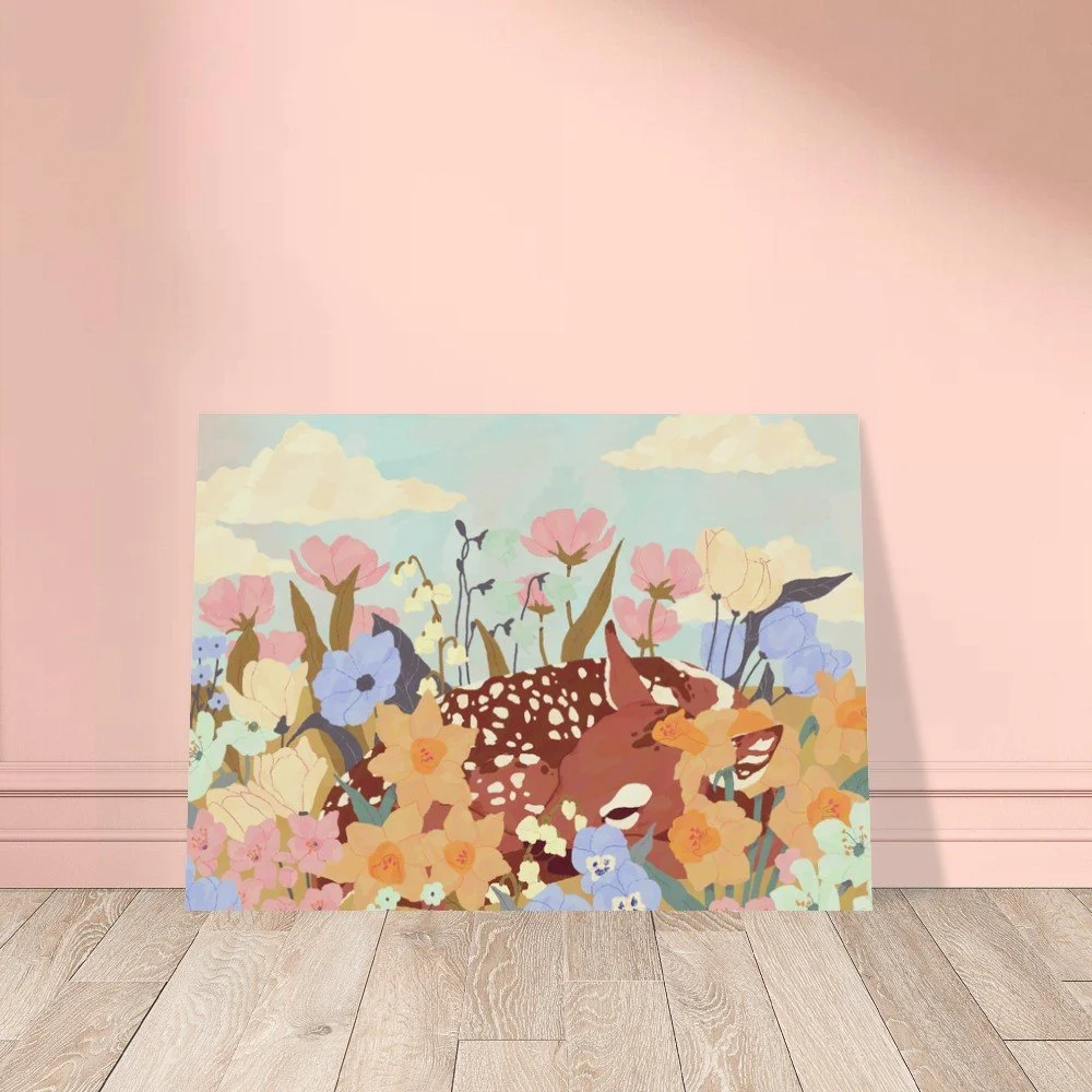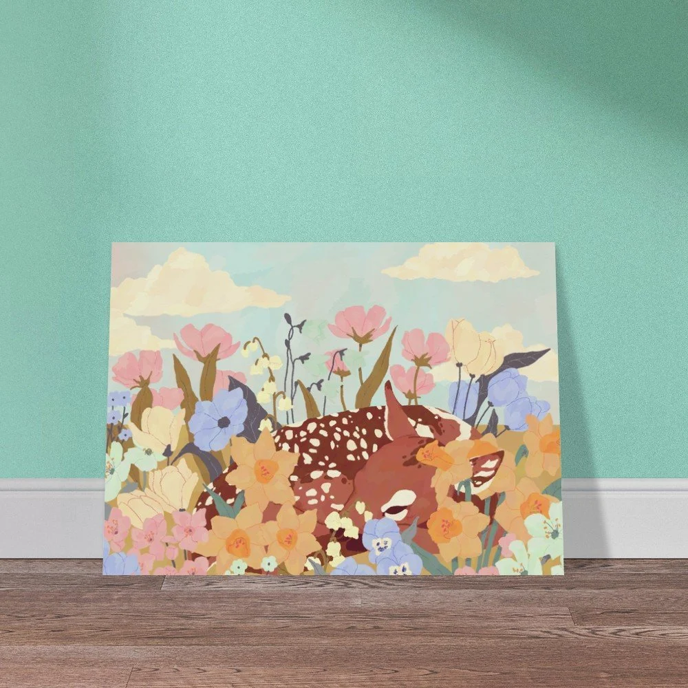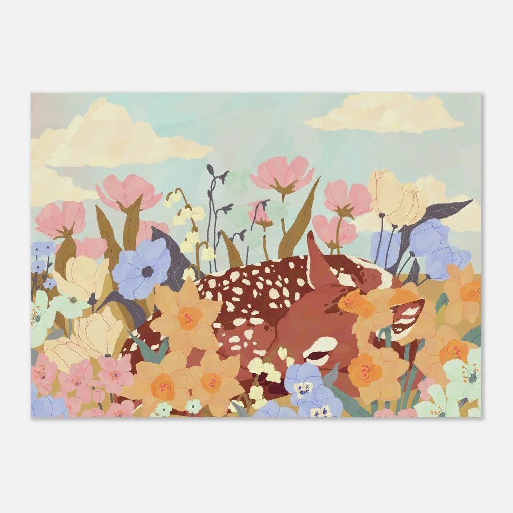 Celebrate the quiet magic of spring with “Spring’s Gentle Lullaby,” a museum-quality fine art print featuring a peacefully sleeping fawn nestled among a vibrant field of spring flowers. Soft pastels, dreamy skies, and lush florals create an enchanting woodland scene that brings warmth, wonder, and calm to any space. Printed on premium archival paper, this illustration preserves every painterly detail—from the fawn’s gentle spots to the delicate blossoms surrounding it. Perfect for nurseries, reading nooks, nature-inspired homes, and anyone who adores serene cottagecore artwork.